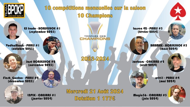 Qui sera le CHAMPION Online Team BPOKP saison 2023-2024 ? Nous connaissons les 10 protagonistes de cette TABLE FINALE ! Les 10 CHAMPIONS à l'issue des dix championnats de la saison : frado - HORSESHOE #1 (septembre 2023) VodkaBlack - PARIS #1 (octobre 2023) José -... » Lire la suite
