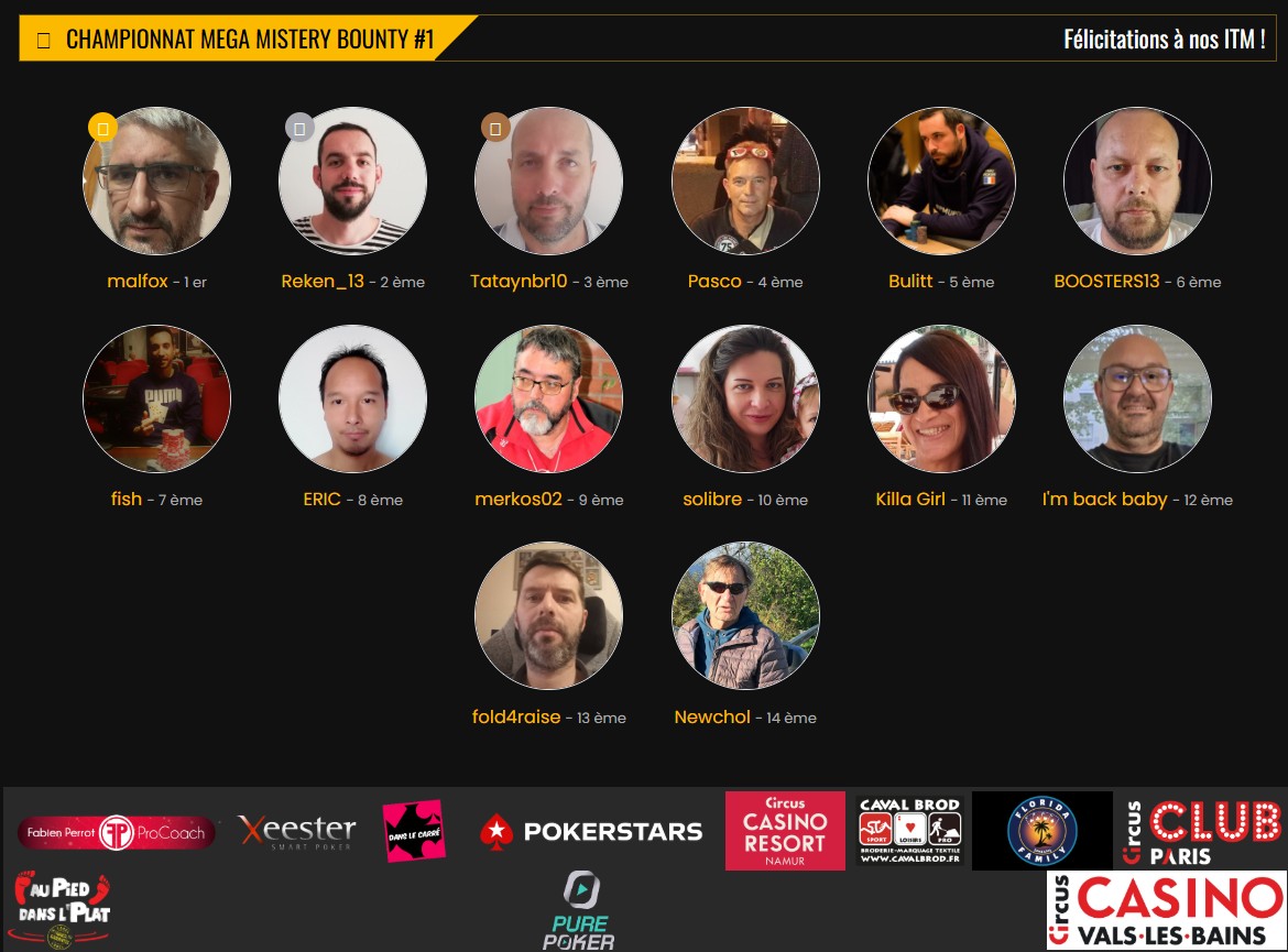 Championnat réservé aux membres Team Bpokp (France). Buy-in 5 €, dotation totale 1 900 € dont 1 ticket PokerStars Open Cannes (15 au 21/12/2025). Format Mystery Bounty : élimine un adversaire apres la fin des inscriptions tardives et découvre le montant de ta prime dans l’enveloppe animée.
